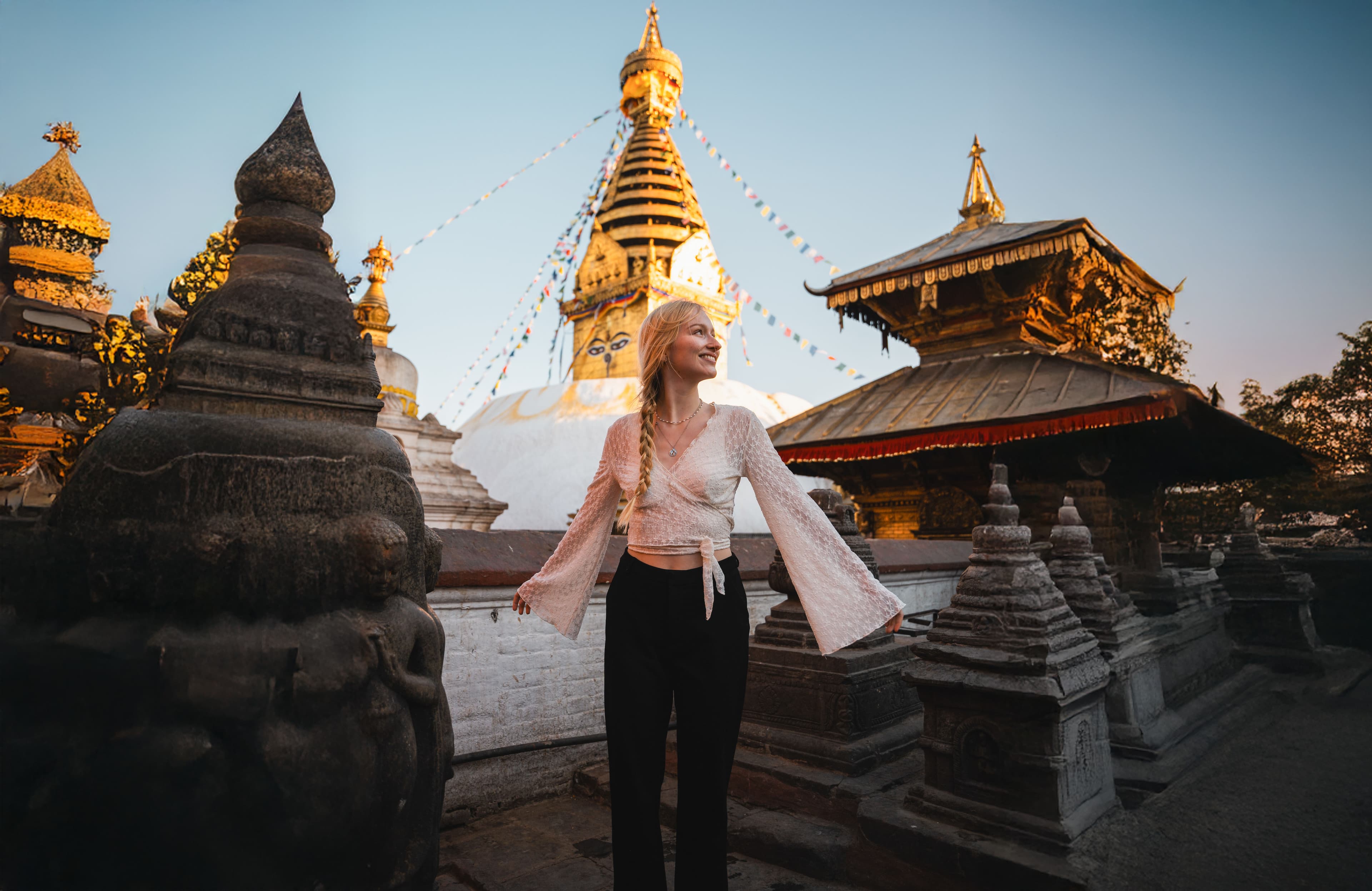 Du stehst am Durbar Square, drehst dich einmal um deine Achse und zählst elf Pagoden – alle aus dem 12. Jahrhundert, alle noch da. Motorräder quetschen sich durch Gassen, in denen Gemüsehändler neben Buddha-Statuen ihre Chilis stapeln, Weihrauch steigt von Tempeln auf. Über allem thront der Swayambhunath auf seinem Hügel – Affentempel genannt, weil Makaken hier das Sagen haben. Fünf Kilometer weiter dreht sich der Boudhanath Stupa, tibetische Mönche murmeln Mantras, Gebetsmühlen quietschen im Takt. Bhaktapur und Patan liegen eine Busfahrt entfernt, mittelalterliche Königsstädte mit Tempelbezirken und Töpferwerkstätten, die seit Jahrhunderten im gleichen Rhythmus laufen.